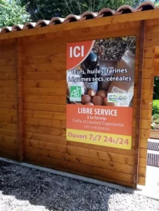 - et surtout proposer à nos clients les produits issus de ces champs tout près d’eux, dans le respect de l’environnement, au prix le plus juste, sans intermédiaires, et leur garantir les produits les plus frais possible, en libre service à la ferme grâce à notre petit chalet en bois qui abrite un distributeur automatique, dans les commerces de proximité ou sur des points de distribution organisés par le réseau de producteurs cagette.